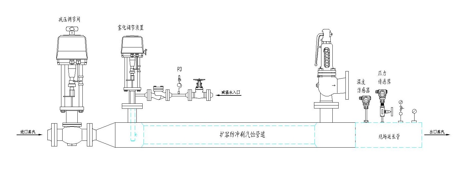 2、 減溫系統由霧化調節噴霧裝置,混合擴容防沖刷汽蝕管道等組成,是過熱蒸汽減溫到用戶需要的蒸汽溫度,蒸汽溫度不能小于該壓力下的飽和蒸汽溫度;