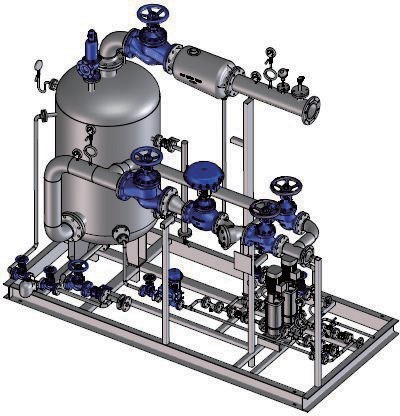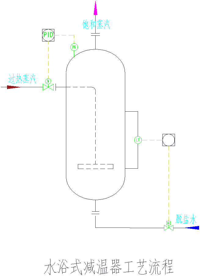 水浴式減溫器是一種直接接觸式減溫器,將過熱蒸汽通過特殊設計的噴管引導進入水浴室中,冷卻水和過熱蒸汽在水浴室中交換熱量,達到過熱蒸汽的冷卻效果,最終產生的飽和蒸汽通過頂部管路送出;水浴式減溫器出口的蒸汽干度較高。一套水浴式減溫系統主要包括:特殊設計的水浴室、壓力及液位控制及相關的控制回路。
